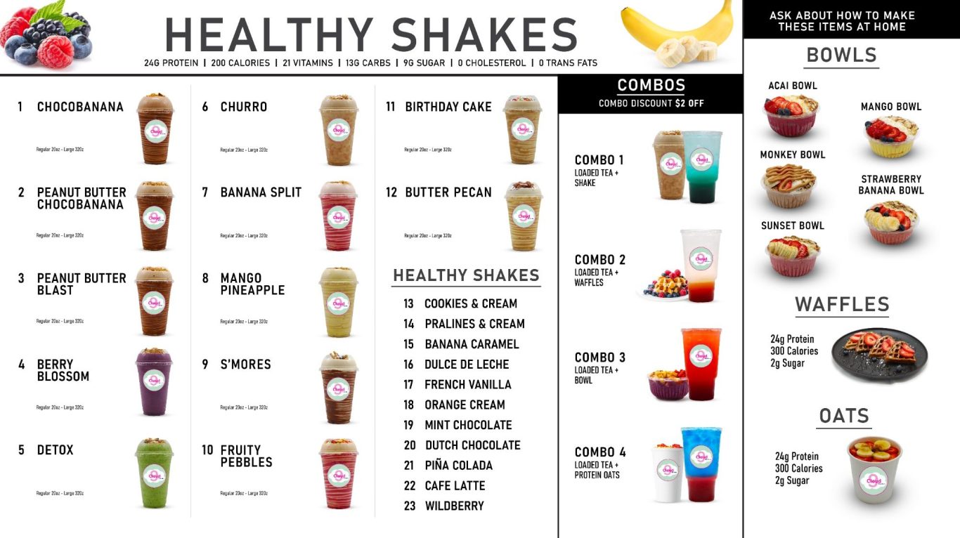 We offer a variety of protein shakes that contain 24-36g of protein, we use a water and soy-based protein! Ask in store for more protein options! We also offer protein bowls, protein oats, protein waffles and now we also have protein donuts!